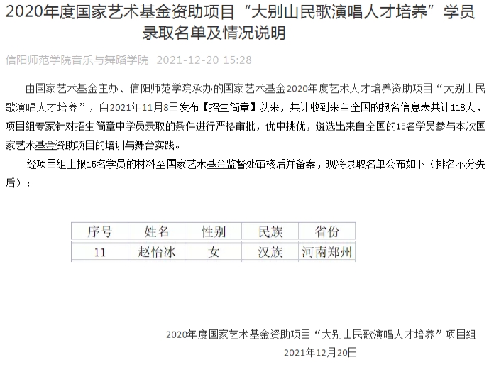 近日,由国家艺术基金主办、信阳师范学院承办的国家艺术基金2020年度艺术人才培养资助项目“大别山民歌演唱人才培养”公布录取通知,公共艺术教育教学中心教师赵怡冰成功入选。
