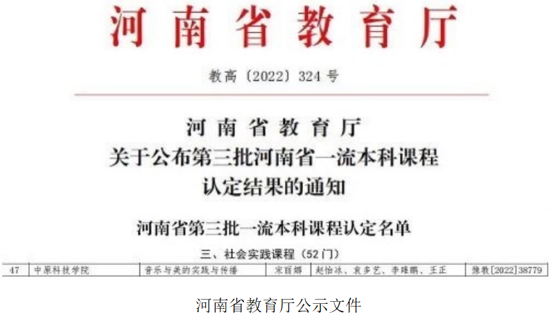近日获悉,公共艺术中心主任宋丽娜负责的《音乐与美的实践与传播》课程获批河南省社会实践类一流本科课程称号,实现了我校美育课程建设的新突破。