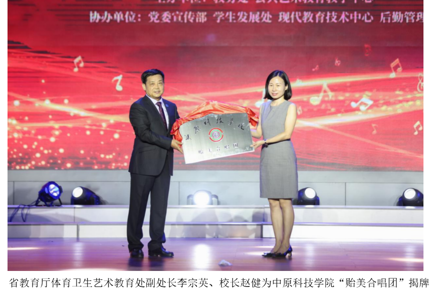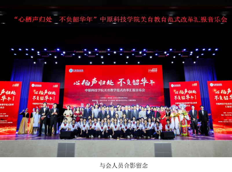 6月15日下午,由教务处、公共艺术教育教学中心主办的“心栖声归处 不负韶华年”中原科技学院美育教学范式改革汇报音乐会在我校健行馆精彩上演。河南省教育厅体育卫生艺术教育处副处长李宗英,中原科技学院理事长李香枝,校长赵健,副理事长仉建涛,理事会发展战略委员会主任娄源功,常务副校长高新战,副校长张东初,校长助理兼教育学院院长冯蔚出席音乐会。