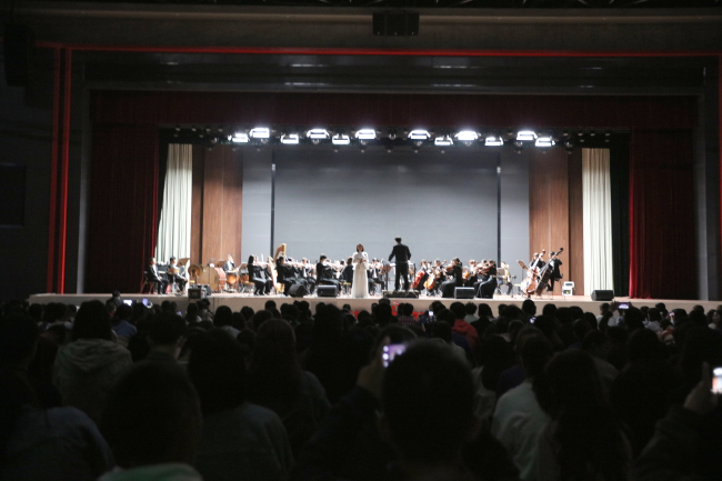 一首革命管弦乐曲《红旗颂》拉开演出序幕,简短有力的曲调,引起了观众们情感上的共鸣。青年指挥家马骥以幽默的语言,通俗易懂的方式为同学们介绍了交响乐团各声部乐器配置的基本常识,各类精彩表演赢得了现场观众的欢呼,为同学们带来了一场听觉与视觉的双重盛宴,让大家感受到了中西方的高雅艺术氛围。