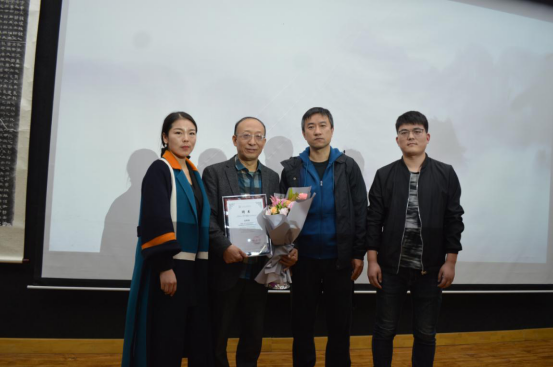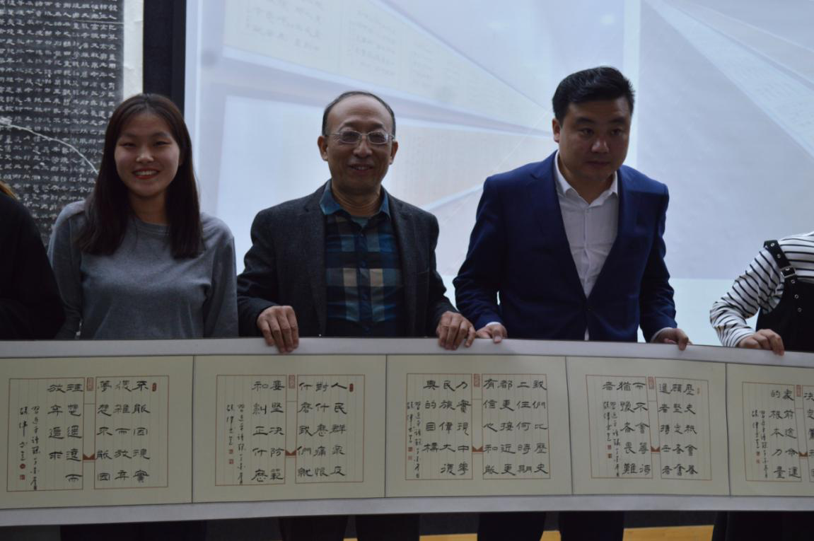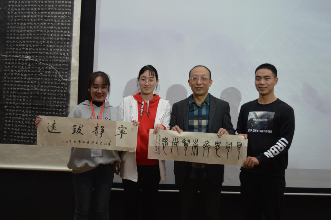 现场互动环节,孙教授展开“习近平语录一百句”作品进行分析讲解,在向大学生传播当代中国价值观念的同时,也用书法艺术诠释了习近平经典语录,让学生充分体会到中国文化精神与书法精神内涵。讲座结束,艺术学院院长张澎为孙教授颁发了特聘教授证书,孙教授以个人名义向公共艺术教育教学中心赠书50本,并赠送学生书法作品数幅。