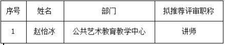 根据中原科技学院《关于我校做好2021年度职称评审工作安排的通知》工作要求,公共艺术教育教学中心职称评审工作严格按照程序进行,经个人申报、中心审核,拟推荐赵怡冰同志参加 2021年度职称评审,现予以公示,征求意见。