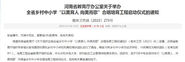 近日,河南省教育厅发布了《关于举办全省乡村中小学“以美育人 向美而歌”合唱培育工程启动仪式的通知》(教体卫艺函〔2023〕275 号),我校成功入围“合唱培育工程首批帮扶团队”。该项目全省首批共选定16所高校,其中民办学校4所,我校为帮扶2所初级中学的唯一民办学校。