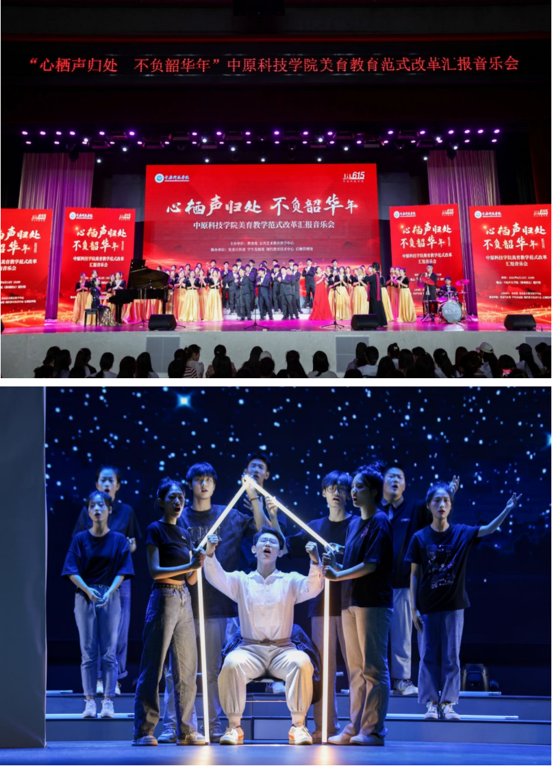 音乐会由三个篇章组成。第一篇章“以美育人 深化改革 多举措推进美育教育”。高新战致辞,肯定了美育教学范式改革的育人成效,同时对下一步美育教育工作提出殷切希望。师生同台表演的混声四部合唱《南屏晚钟》、独唱《墨梅》、器乐重奏改编曲《查尔达什舞曲》,展现了我校美育工作进行的一系列卓有成效的教学改革成果;第二篇章“以美琢玉 塑造品牌 高质量提升美育教育”,省教育厅体育卫生艺术教育处副处长李宗英、校长赵健为中原科技学院“贻美合唱团”隆重揭牌,第一届大学生艺术展演获奖作品京剧《梨花颂》、独诵《我的爸爸》、男女对唱《飞云之下》,表现出我校美育“学、训、展、行”四位一体的实践教学模式和“一·二课堂”融通互济的美育教育体系成效;第三篇章“以美培元 服务社会 高水平引领美育教育”,长垣市南浦中心学校“清音合唱团”带来的童声合唱《亲爱的旅人啊》,我校师生同台表演的表演唱《星星点灯》、合唱《灯火里的中国》,展现了我校持续发挥省级公共艺术工作“一类学校”示范引领作用,将校内教学、实践成果应用于社会服务,助力乡村振兴的系列行动。