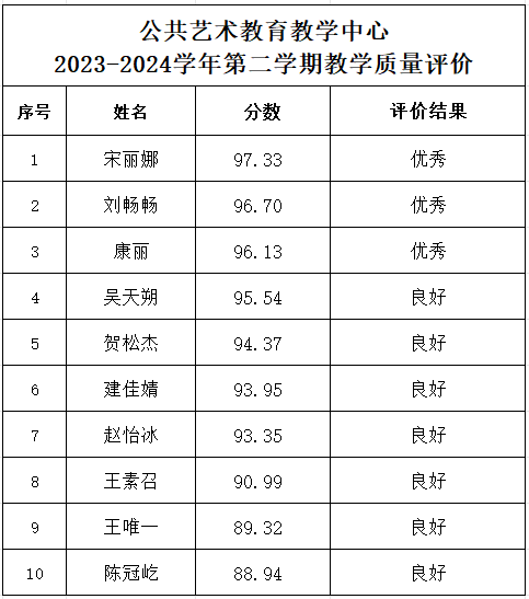 根据《公共艺术教育教学中心专任教师教学质量考评标准》,坚持公开、公平、公正的原则,现将本学期教学质量考评结果公示如下: