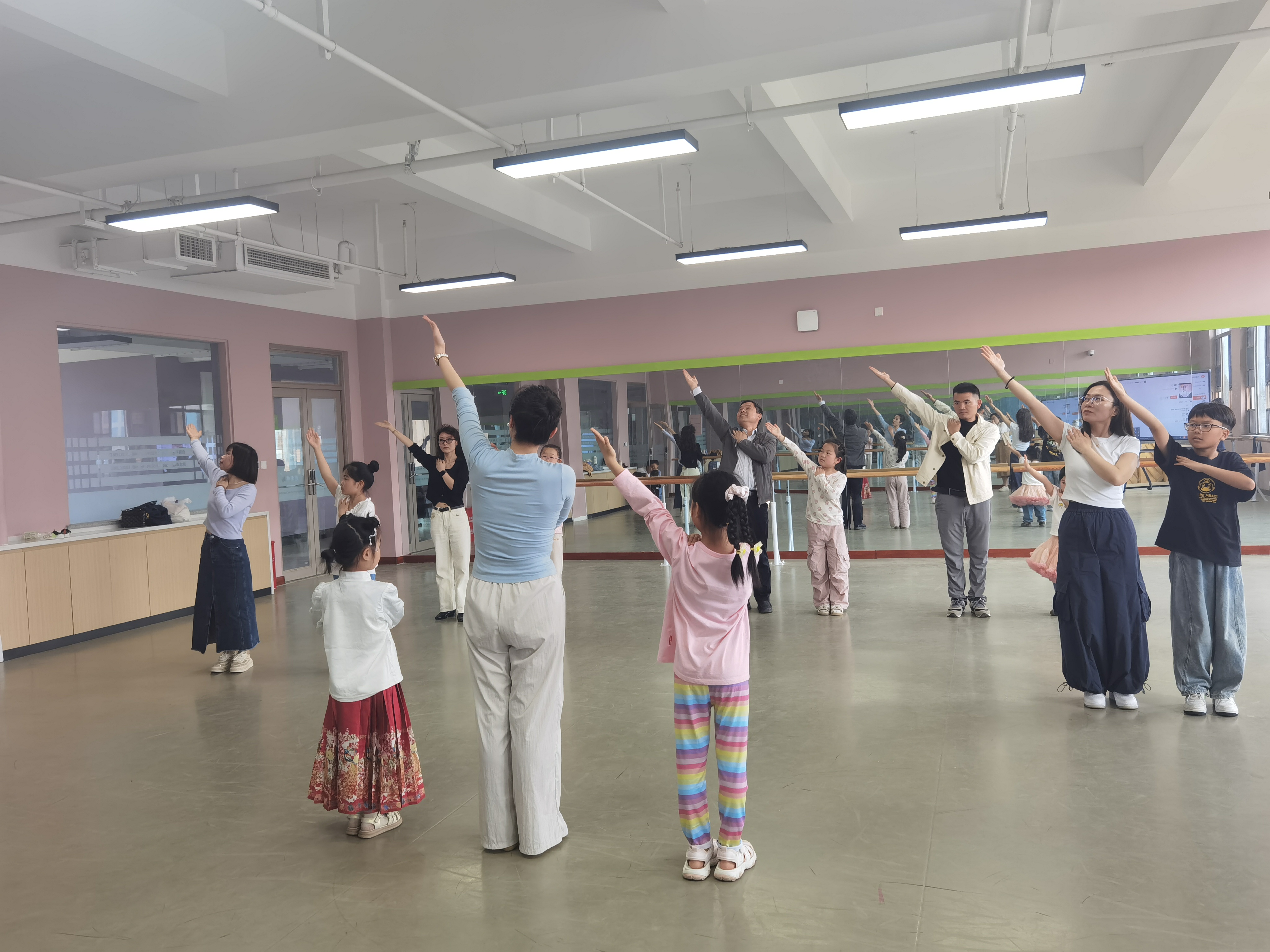 活动开始,孩子们首先进行了充满趣味的肢体协调性与柔韧性基础训练。刘老师通过生动活泼的教学方式,引导孩子们认识自己的身体,体验律动的快乐。随后,亲子沉浸在精选舞蹈片段的体验式学习中,模仿、练习、表达,在音乐的节奏中感受舞蹈的韵律美、肢体语言的奇妙以及亲子关系的和谐。活动现场气氛热烈,孩子们专注投入,小脸上洋溢着兴奋与自信;陪同的家长们或轻声鼓励,或用镜头记录下这美好的亲子互动瞬间,温馨满溢。
